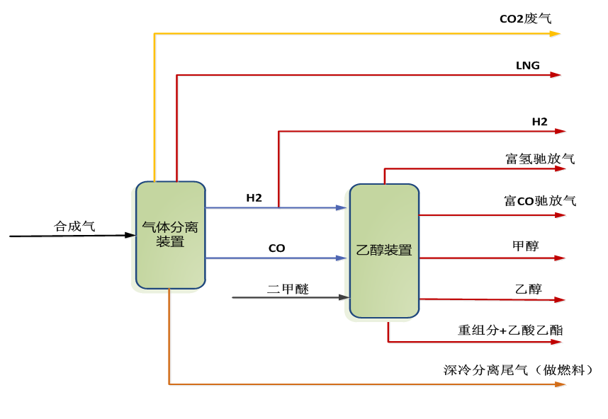 該項(xiàng)目主要產(chǎn)品乙醇、甲醇、氫氣、LNG、重組分及乙酸乙酯。項(xiàng)目擬采用合成氣和二甲醚為原料:外來(lái)合成氣經(jīng)MDEA脫碳后,進(jìn)入氣體分離裝置,氣體分離裝置采用深冷分離+PSA工藝路線(xiàn)生產(chǎn)H2、CO,同時(shí)副產(chǎn)LNG及深冷分離尾氣(做燃料)。外來(lái)二甲醚與CO、H2進(jìn)乙醇裝置生產(chǎn)乙醇產(chǎn)品,同時(shí)副產(chǎn)甲醇、重組分及乙酸乙酯產(chǎn)品。