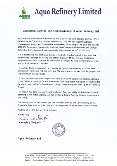 近日,由北京石油化工工程有限公司負責設計及部分采購工作的孟加拉項目(2500B/D凝析油蒸餾裝置和1500B/D半再生重整裝置)業主AQUA Refinery公司發來感謝信,對我公司在項目設計、建設方面做出的努力給予了高度肯定和贊揚,并對在孟加拉國新冠疫情爆發時期,為配合項目試車工作我公司派出的兩位專家表示感謝。