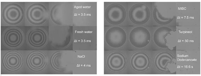 圖2. 不同溶液中疏水表面退潤濕所需時間(視場大。384×384 μm)
