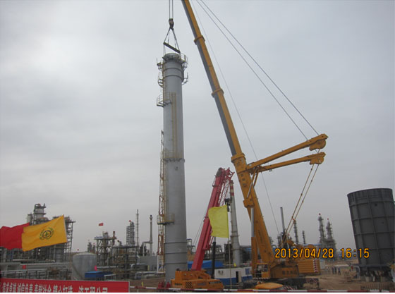 2013年4月28日早晨,隨著吊車發動機隆隆的聲響,100項目(煤-油共煉試驗示范項目)現場第一吊--煙囪吊裝開始作業,這標志著100項目進入了設備安裝階段。